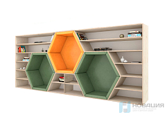 Книжный стеллаж оснащен тремя мягкими посадочными местами в форме сот. Обивка изготовлена из материала, который легко очищается от загрязнений. Стеллаж монтируется к стене, крепеж поставляется в комплекте.