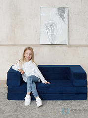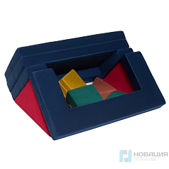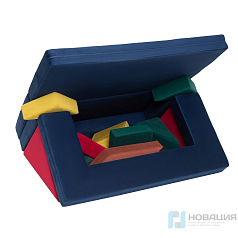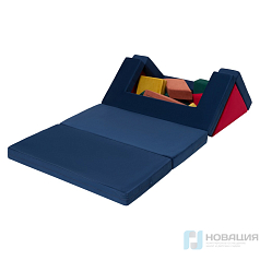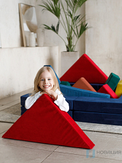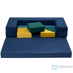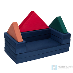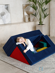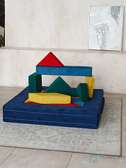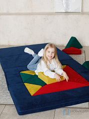 Бескаркасная конструкция состоит из 4 прямоугольников и 8 фигурок разных размеров и форм. Может собираться в диван, матрас или домик игр. Не имеет острых углов.