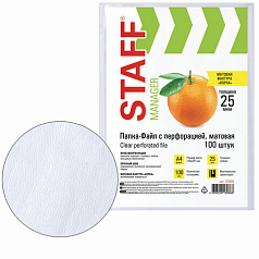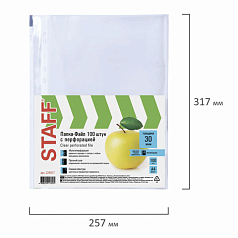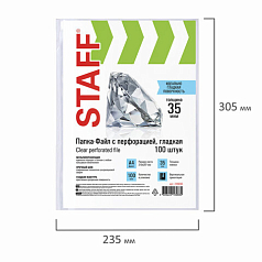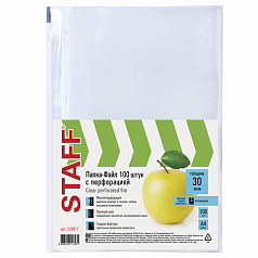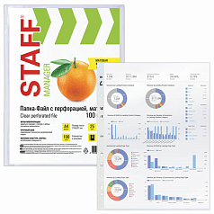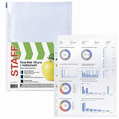 Перфорированные папки-файлы STAFF обеспечивают сохранность бумажных носителей, защищают их от истирания, увлажнения, загрязнения, при этом обладают требуемыми параметрами прочности и прозрачности, позволяют систематизировать все важные документы.