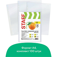 Папки-файлы перфорированные, А4, STAFF, комплект 100 шт., гладкие, 25 мкм, 224814