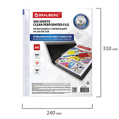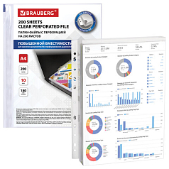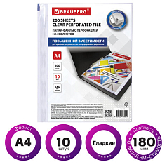 Папки-файлы перфорированные БОЛЬШОЙ ВМЕСТИМОСТИ до 200 листов, А4, КОМПЛЕКТ 10 шт., 180 мкм, BRAUBERG, 226833