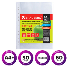 Папки-файлы перфорированные А4+ BRAUBERG, КОМПЛЕКТ 50 шт., гладкие, ПЛОТНЫЕ, 60 мкм, 223084