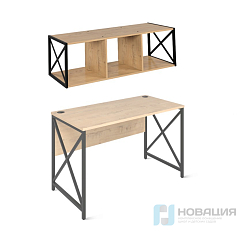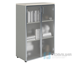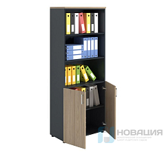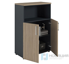 Шкаф состоит из металлических стоек, полок и закрытой секции с двумя дверьми, в которй есть полка, регулируемая по высоте с шагом 32 мм. Для плавного предусмотрены мебельные петли с доводчиком. Каркас закреплен на стойках из металлических опор с иксобразными элементами.