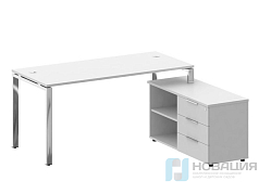 Устойчивая конструкция на подпятниках соединяется со столом на проножке. Топ тумбы частично открыт. Его поверхность может быть полезна для хранения раздаточного материала и других часто используемых вещей.