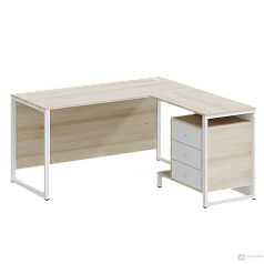 Мебель предназначена для кабинета в школе, университете, ином муниципальном учреждении, состоит из 2-х частей - стол с прямоугольной рабочей поверхностью и основательными опорами из ЛДСП и вместительная тумба, расположенная перпендикулярно. В тумбе имеются 3 выдвижных ящика, 4 сквозных отделения (полки).