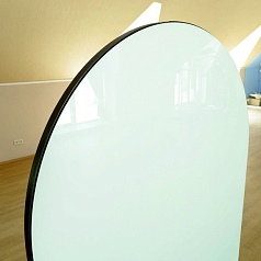 Покрытие классной доски исключает блики. Лист из стали окружается алюминиевым профилем и устанавливается на стойку. На белую поверхность можно проецировать изображения. Обе поверхности притягивают магниты.