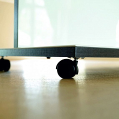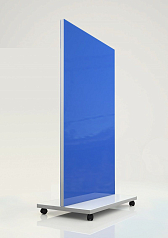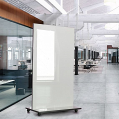 Изделие подходит для размещения плакатов, ведения записей маркерами сухого стирания, и проецирования изображений. Лист из стали окружается алюминиевым профилем и устанавливается на стойку с колесами.