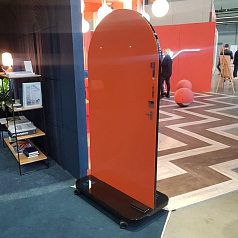 Изделие в металлическом профиле оснащается передвижной стойкой с круглым основанием на 5-ти колесах.
