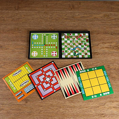 В набор входят: шахматы, шашки, нарды, фигуры, кости и игральная доска.