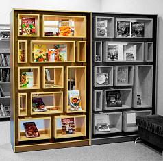 Стеллаж со встроенными сквозными отделениями подойдет для выставки в современной библиотеке.