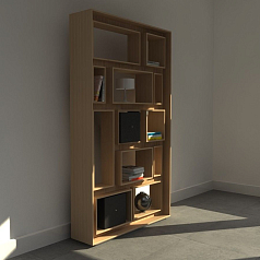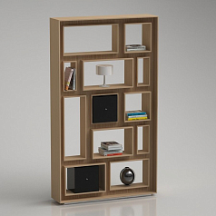 Прямоугольный корпус оснащается рядами из 2-х или 3-х ниш произвольной ширины. В отделениях расставляются образцы книг и таблички. Доступ к полкам открыт с обеих сторон, поэтому стеллаж можно использовать как перегородку для зонирования.