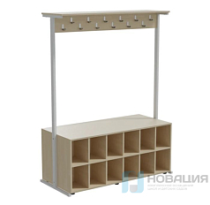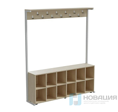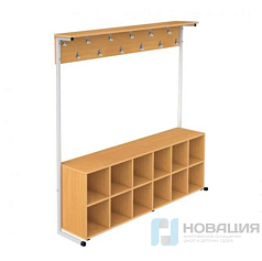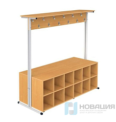 Вешалка рассчитана на 36 мест. Под вешалкой с полкой для головных уборов и крючками для одежды располагается стеллаж.
