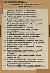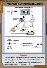 Стенд размещается в учебных лабораториях. Для листов со сменной информацией предусмотрены прозрачные карманы внизу панели. Верхняя часть представлена яркими изображениями с перечислением общих мер безопасности.