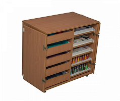 Тумба с 2-створчатой распашной дверцей и выдвижными элементами размещается в школьном кабинете домоводства и технологии. Специальная мебель помогает содержать в порядке швейные принадлежности и фурнитуру.