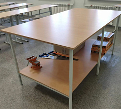 Стол используется во время создания чертежей, раскроя одежды. Конструкция с двумя плоскими поверхностями (для работы и хранения предметов) укреплена парами перемычек. Опоры металлические. Каркас выполнен из профильных труб сечением 25х25 мм. Столешницы располагаются в 2 яруса.