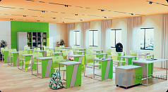 Столы комбинируются между собой. Перед работой в группах изделия сдвигаются, выстраиваются в фигуры и волнообразные композиции. Параметры мебели подстраиваются под аудиторию: высота стола фиксируется в 5-ти положениях.