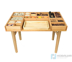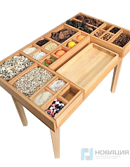 Тактильная сенсорная панель на другой боковой поверхности короба предназначена для развития тактильной чувствительности и стимуляции мелкой моторики.