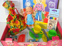 - Набор кукольной посуды (2 чашки, 2 блюдца, 2 чайные ложечки),