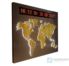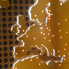 Стенд содержит карту мира. Города обозначены светодиодами красного свечения, которые активируются независимо друг от друга по нескольким программам. Программы задаются при помощи пульта дистанционного управления.