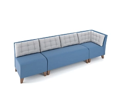 Модули разных конфигураций выстраиваются в цепочку. Каркас каждого пуфа оклеен ППУ и обтянут чехлом, который дезинфицируется и моется без последствий. Высота пластиковых опор составляет 25 мм.