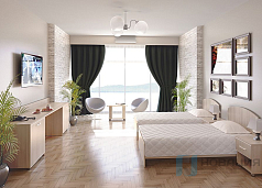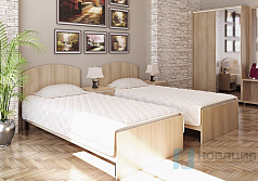 Кровать для зоны отдыха оснащается ортопедическим основанием. Деревянные ламели настилаются на каркас из труб сечением 25х25 мм. 1-местная мебель без боковых бортов дополнена 2-мя прямоугольными вертикальными панелями с кромкой ПВХ.