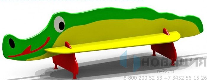 Скамейка с 2-мя сиденьями подходит для отдыха на улице. Художественно оформленная перегородка выполнена в виде крокодила. Элементы с закругленными углами соединяются при помощи пазов. Опоры дополнены металлическими подпятниками.