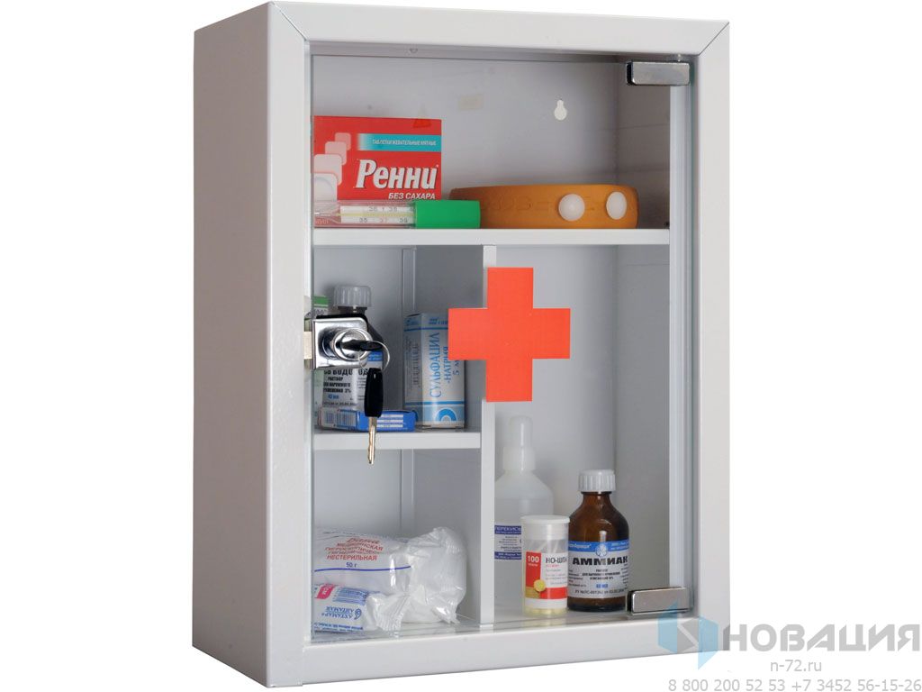 Огнеупорная настенная аптечка с дверцей на замке размещается в медицинском кабинете ДОУ или школы. 4 отделения обеспечивают сохранность лекарственных средств.