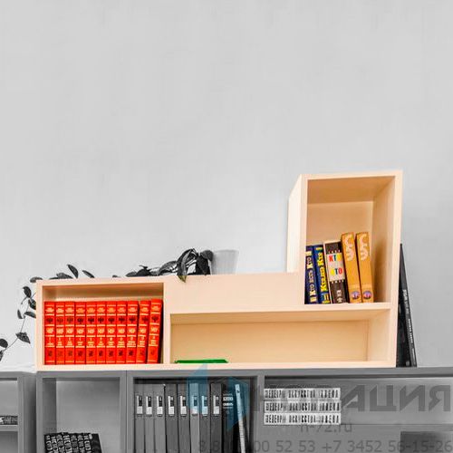 Модуль в форме буквы "L" оснащен тремя секциями для хранения книг, периодики или других предметов. Ячейки отличаются друг от друга высотой и шириной, поэтому подойдут для разноформатных изданий.