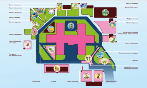 На баннере представлена карта, которая включает здание детского сада и местоположение растений, которые растут на его территории. Схема создается индивидуально по материалам заказчика.