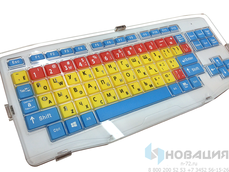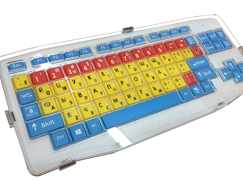 Клавиатура для людей с нарушениями моторики адаптирована под особенные потребности. Каждая кнопка заглублена во избежание нажатия нескольких соседних кнопок одновременно. Размеры цветных клавиш увеличены для удобства пользователя.