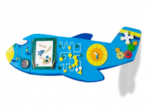 Изготовлен в виде самолета. На игровой панели размещены элементы для развития тактильного и визуального восприятия: шестеренки, сортер с бусинами, пропеллер, лабиринты, циферблат и пр. Используется для тренировки мелкой моторики и координации движений.
