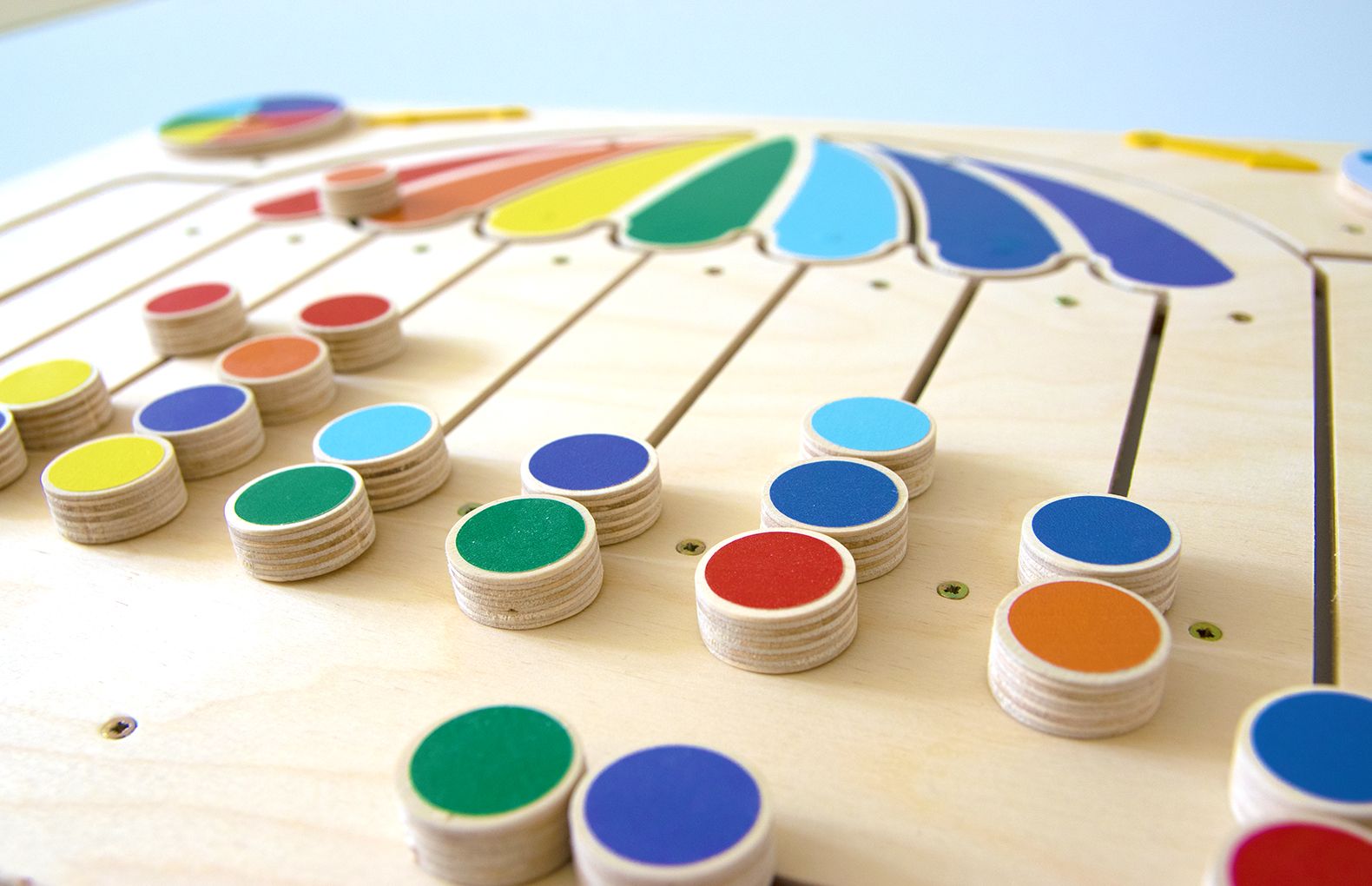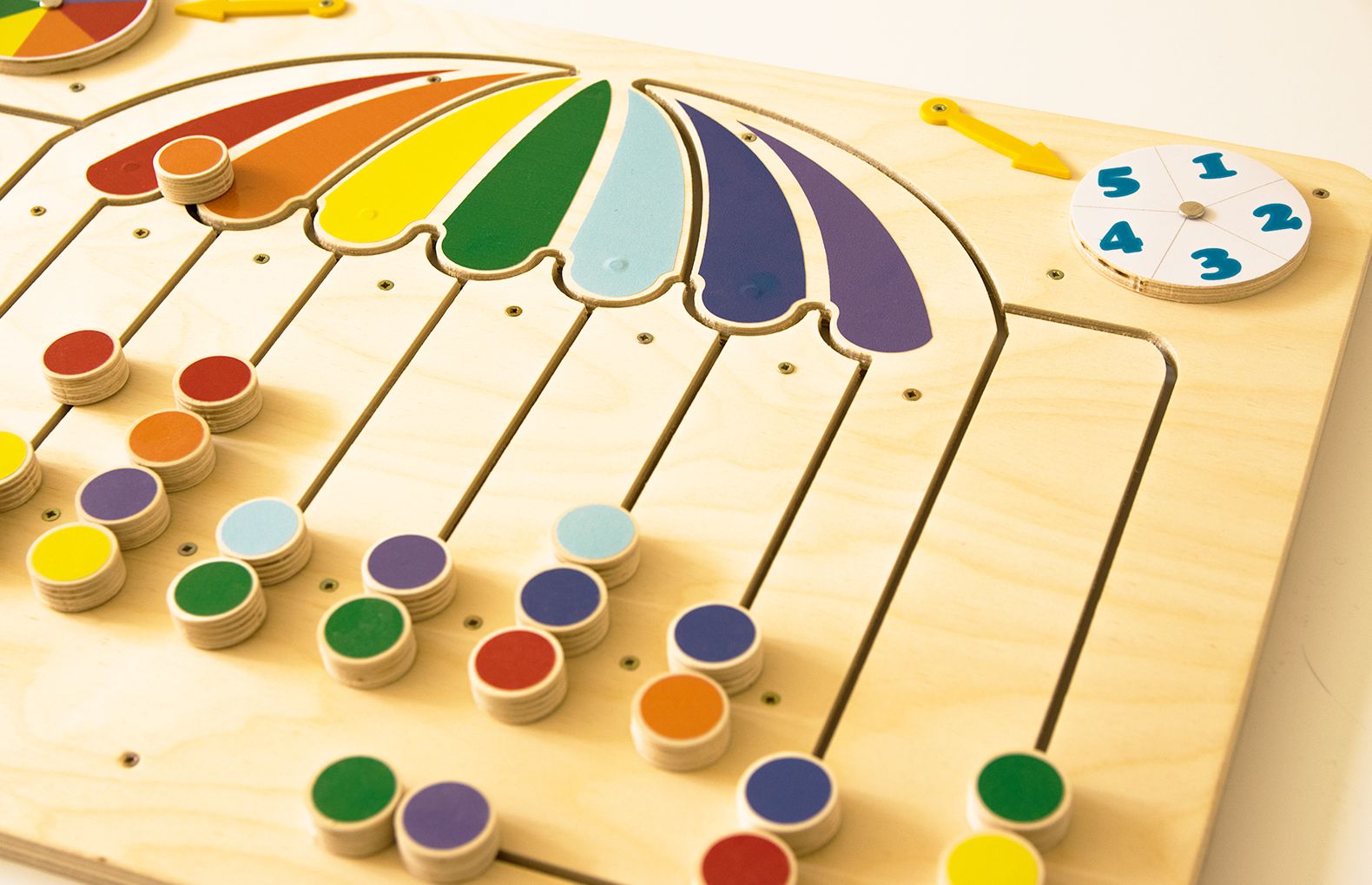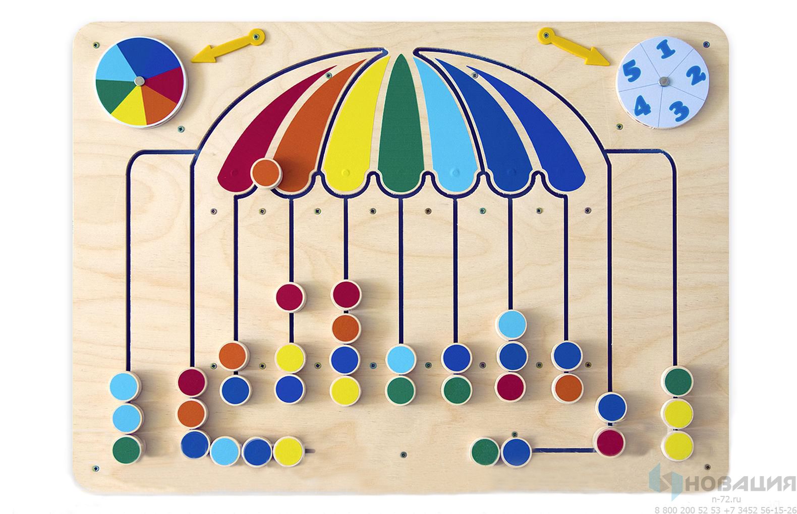 Цветной бизиборд для кабинета психолога, логопеда или рекреационной зоны ДОУ представлен движущимися элементами и желобами лабиринтов. На гладкой панели изображается зонт с фишками в виде капелек. Вращением циферблатов определяется, на какое количество шагов передвинется фишка определенного цвета. Ребенок учится считать и запоминает названия цветов, совершенствует мелкую моторику.