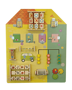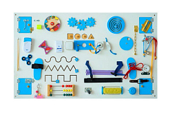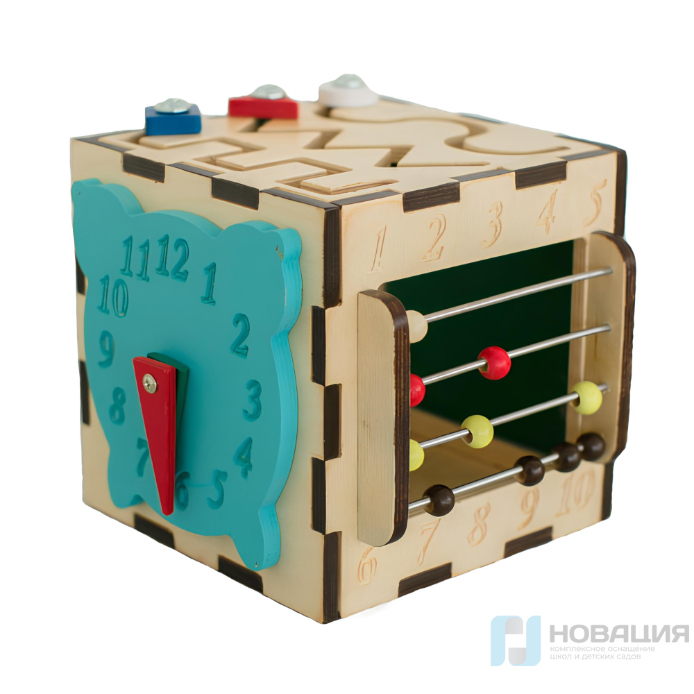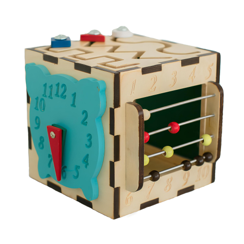 Каждая сторона куба оснащена мелкими тактильными элементами: циферблат, счеты, резные дорожки и пр. Используется для развития тактильного восприятия, мелкой моторики, памяти и координации движений.