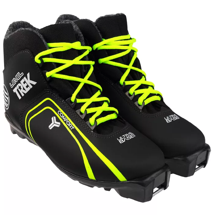 Лыжные ботинки со специальной пропиткой защищены от влаги и ветра. Пористый внутренний материал сохраняет тепло. Черная обувь украшается цветными элементами, логотипом. У ботинка с яркой шнуровкой мягкий кант и язык. Спортивная обувь подходит для креплений SNS.