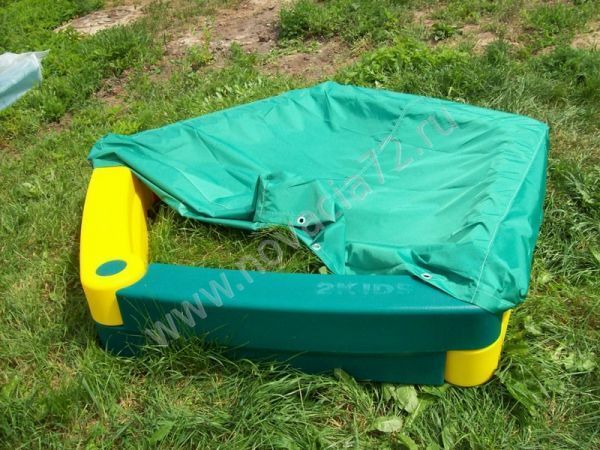 Изготовлен из специального водоотталкивающего материала зеленого цвета. Легко надевается на песочницу. Предназначен для защиты песка от непогоды, осадков и домашних животных. Полностью соответствует форме песочницы. Упакован в удобную сумку.