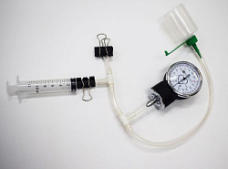 Датчик температуры выполнен на основе терморезистора. Пластиковые или резиновые трубки подсоединяются к его штуцеру (деталь над подвижным основанием цилиндра).