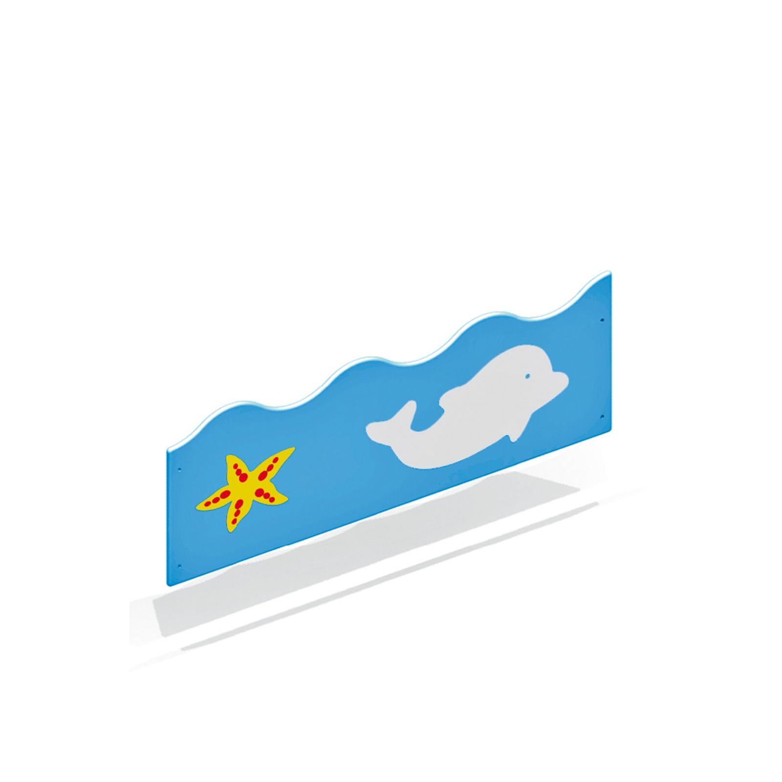 Высота фигурного элемента позволяет наблюдать за происходящим на площадке с расстояния. Отшлифованная влагостойкая фанерная панель окрашена в голубой цвет, декорирована изображениями. Верхний край панели ─ волнообразный.