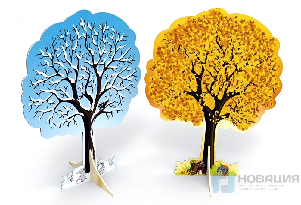 Изделие размещается в ДОУ, прочные подставки не дают резной панели упасть. С 2-х сторон на поверхность из МДФ наносится рисунок: дерево с листвой или без, в теплой и холодной цветовой гамме соответственно. Контуры панели из МДФ закругляются.