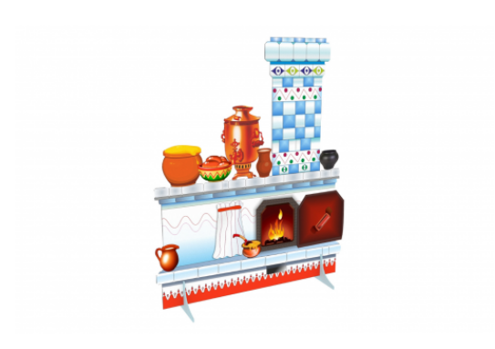 Декорация с изображением печки, глиняных горшков и самовара используется во время утренников или спектаклей в ДОУ.