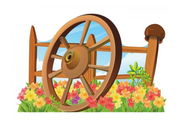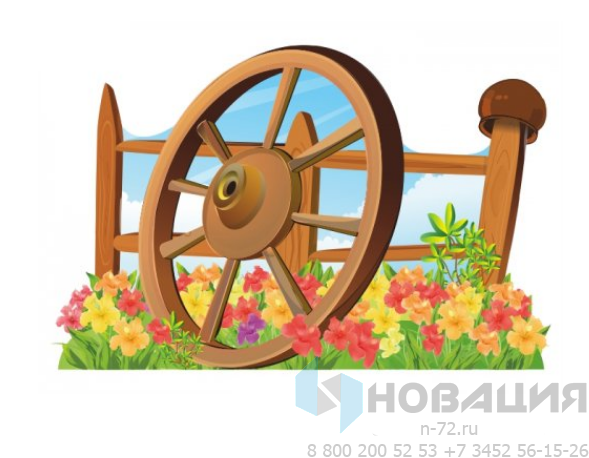 Яркая декорация представлена панелью из МДФ с изображением деревянного забора, глиняного горшка, колеса и цветов. Панель опирается на подставку.