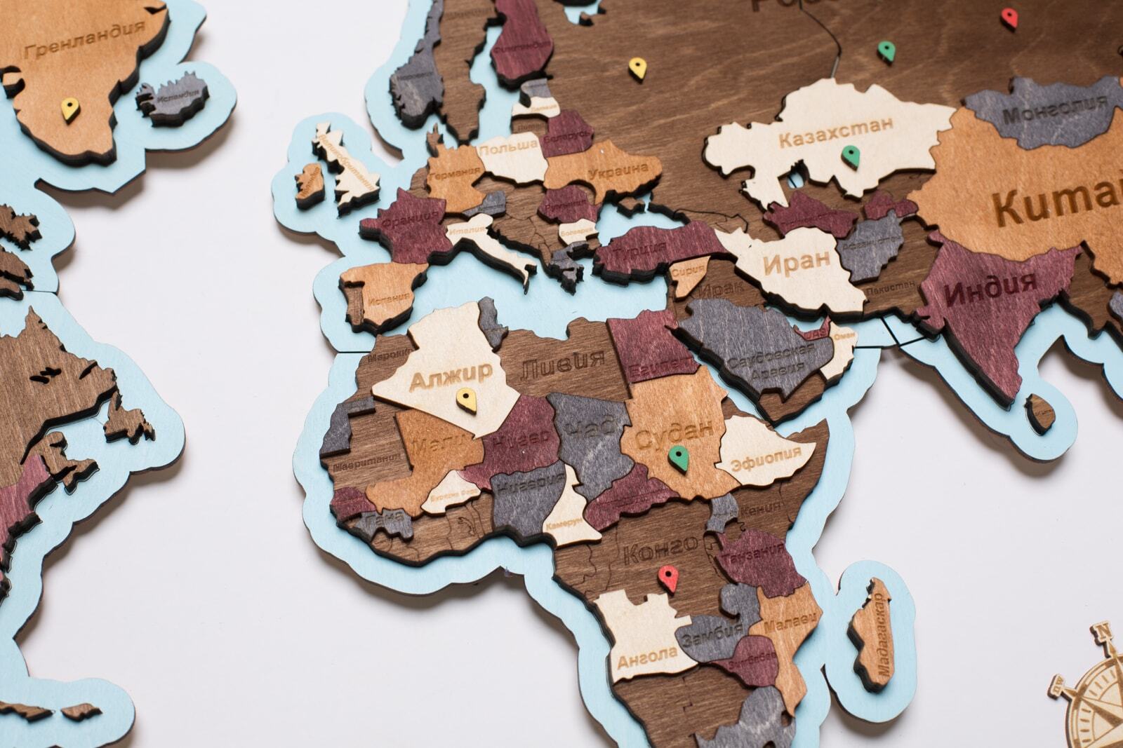 Настенная карта Мира украсит кабинет географии. Отшлифованные элементы в виде континентов составляются в единую картину с государственными границами и названиями территорий. Текст на русском языке виден издалека. Конструкция дополняется подсветкой, которая работает от розетки и переключается с помощью пульта ДУ. Страны подсвечиваются 16 разными цветами.