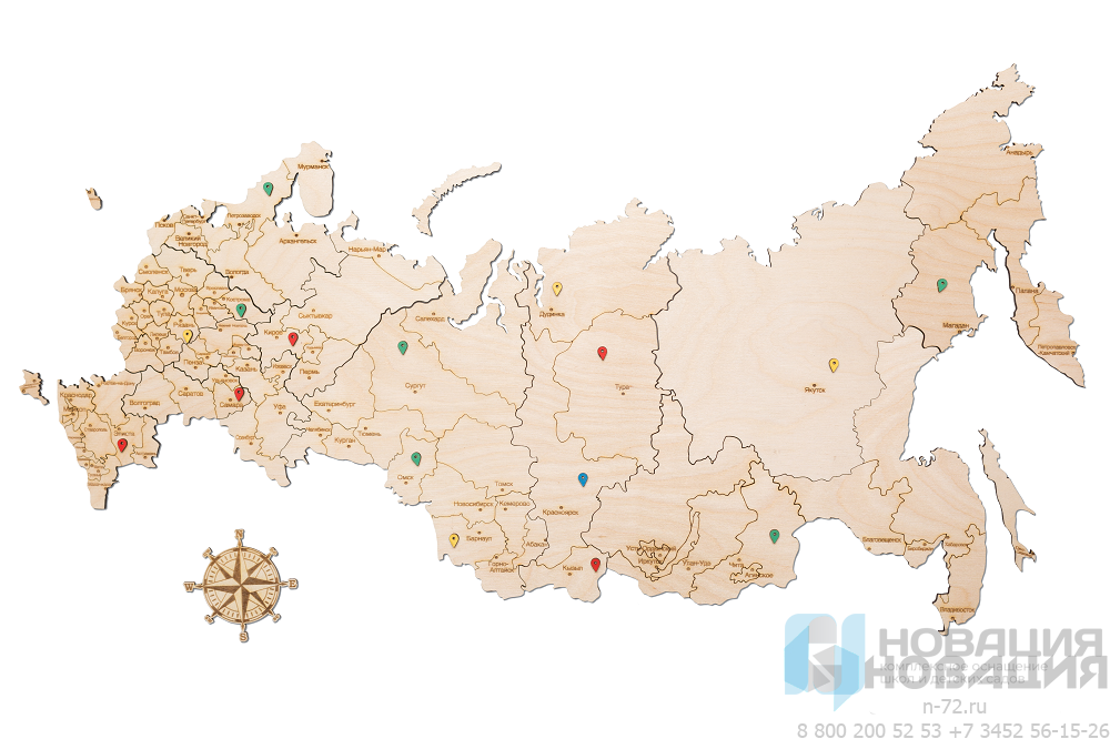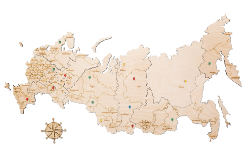 Фигурная карта России составляется из деревянных пазлов. Настенная конструкция украсит кабинет географии. Отшлифованные элементы соединены в очертания страны с границами областей, обозначениями и названиями крупных городов на русском языке. Дополнительно закрепляется изображение компаса для определения сторон света.