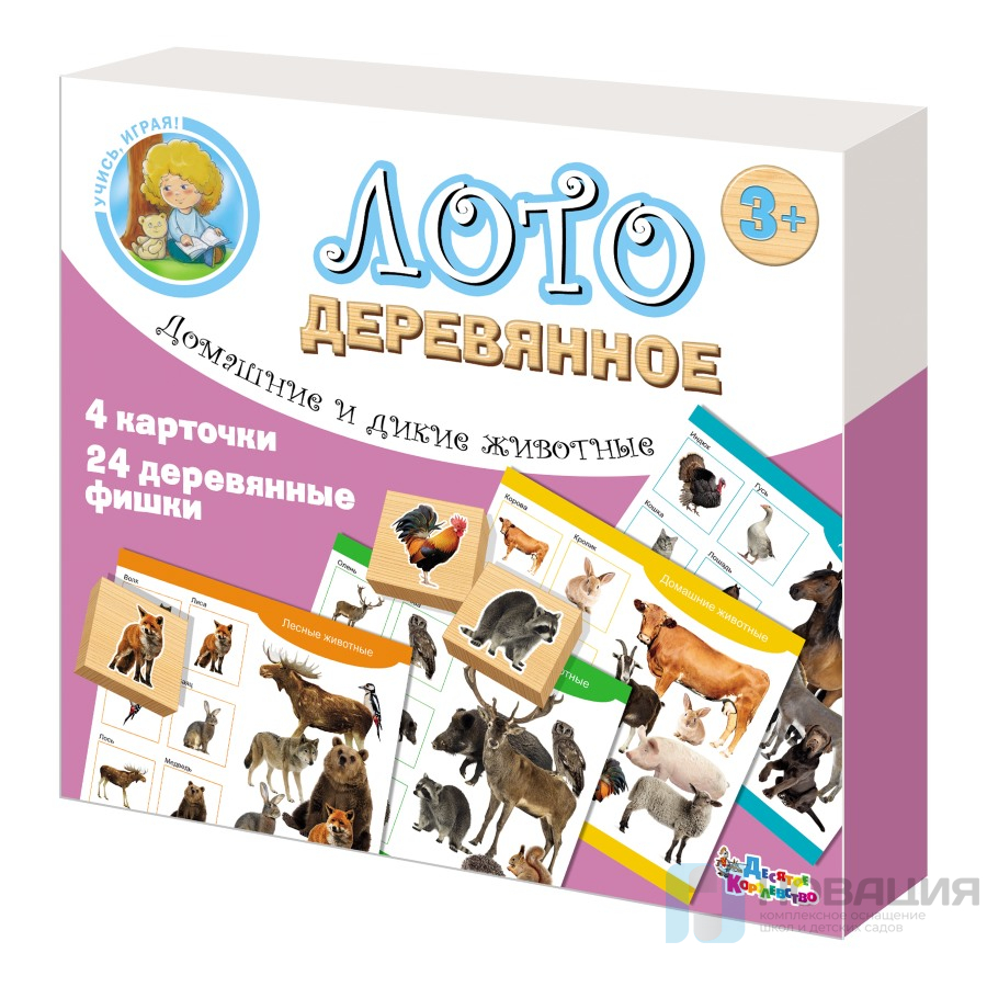 Настольная игра для тренировки памяти, логики и внимания выполнена из дерева, элементы отшлифованы. На карточках и фишках изображены домашние и дикие животные. Принцип действий схож с правилами классического лото: игра направлена на поиск соответствий. Ребенок составляет пары из элементов с одинаковыми картинками. Во время занятий происходит запоминание новых слов, цветов и форм, тренируется мелкая моторика, развивается логическое мышление.