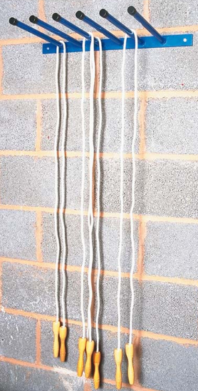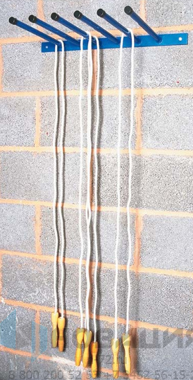 Настенная конструкция представлена 6 кронштейнами из металлических труб на едином основании, которое помогает экономить пространство в спортзале. Концы держателя оснащаются заглушками.
