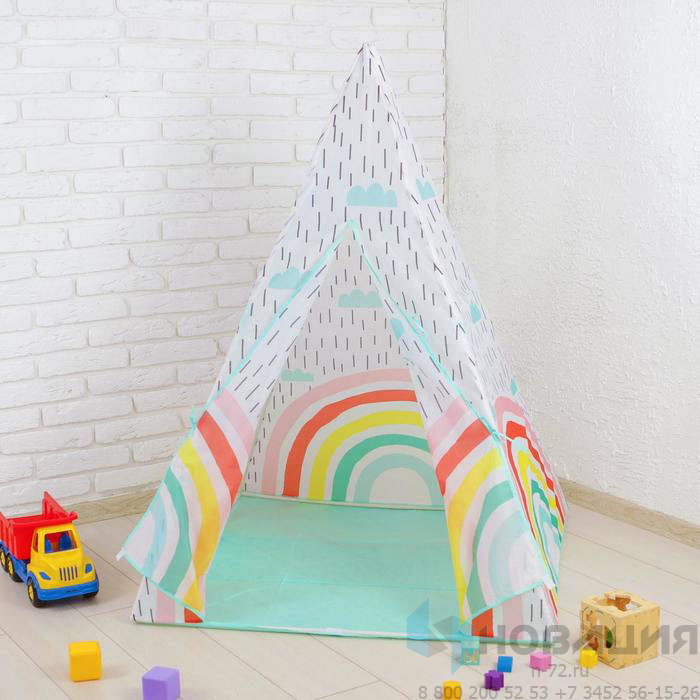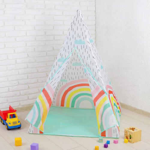 Палатка в форме вигвама украшена изображением радуги. Основание прямоугольное. Половины текстильной дверцы отгибаются в стороны, чтобы открыть вход.