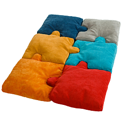 Бескаркасная конструкция состоит из 4 прямоугольников и 8 фигурок разных размеров и форм. Может собираться в диван, матрас или домик игр. Не имеет острых углов.