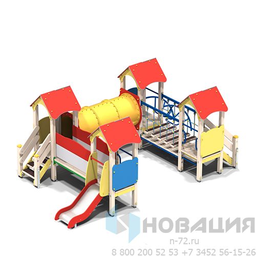 В составе комплекса: 4 крытые башни, горка, подвесной мост, поручни, лестница, перекладины, наклонная лиана, дугообразный мост.