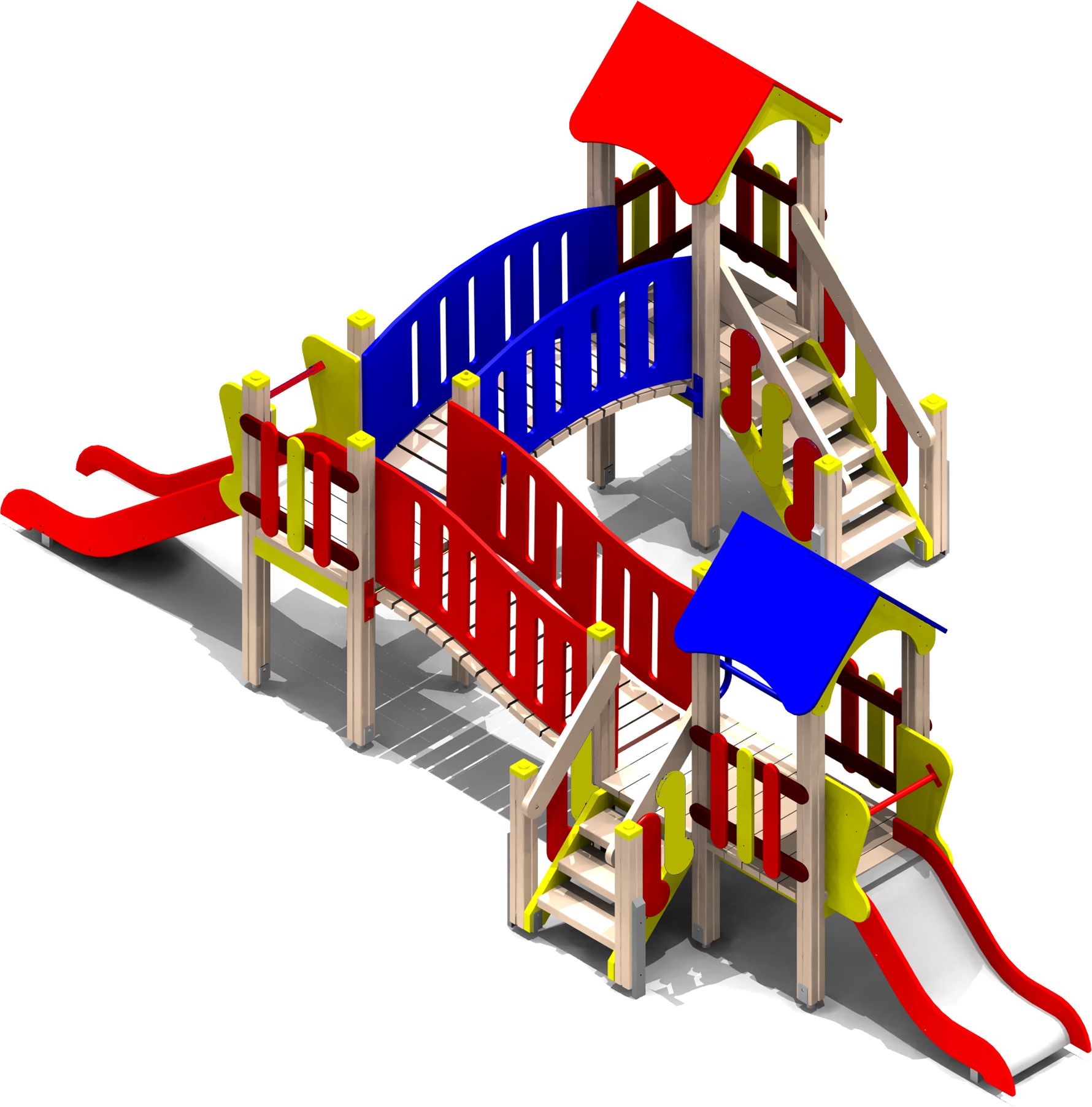 Перила лестницы, настилы мостов и полы изготавливаются из деревянных досок. Башни закрываются от ветра 2-скатными крышами. Заборчики, ограждения мостов с перфорацией, крыши, бортики горок, защитная секция и ступеньки лестницы выполняются из влагостойкой фанеры. Нержавеющие скаты горок на стартовых участках оборудуются перекладинами и защитными боковыми экранами.