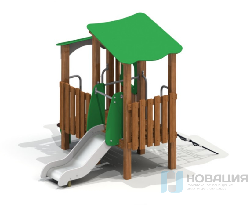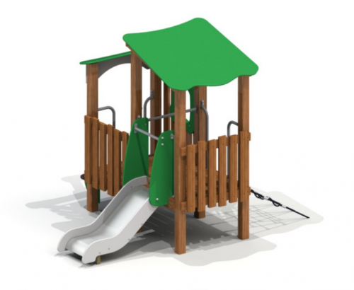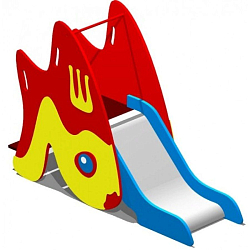 В комплексе с горкой есть поручни и ограждения, защитная секция и перекладина. Площадки на высоких опорах дополнены крышами. Скат разделен на участки с разным уклоном, чтобы ребенок плавно приземлился. Нержавеющая поверхность окружена бортиками.