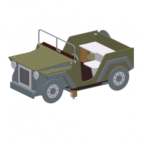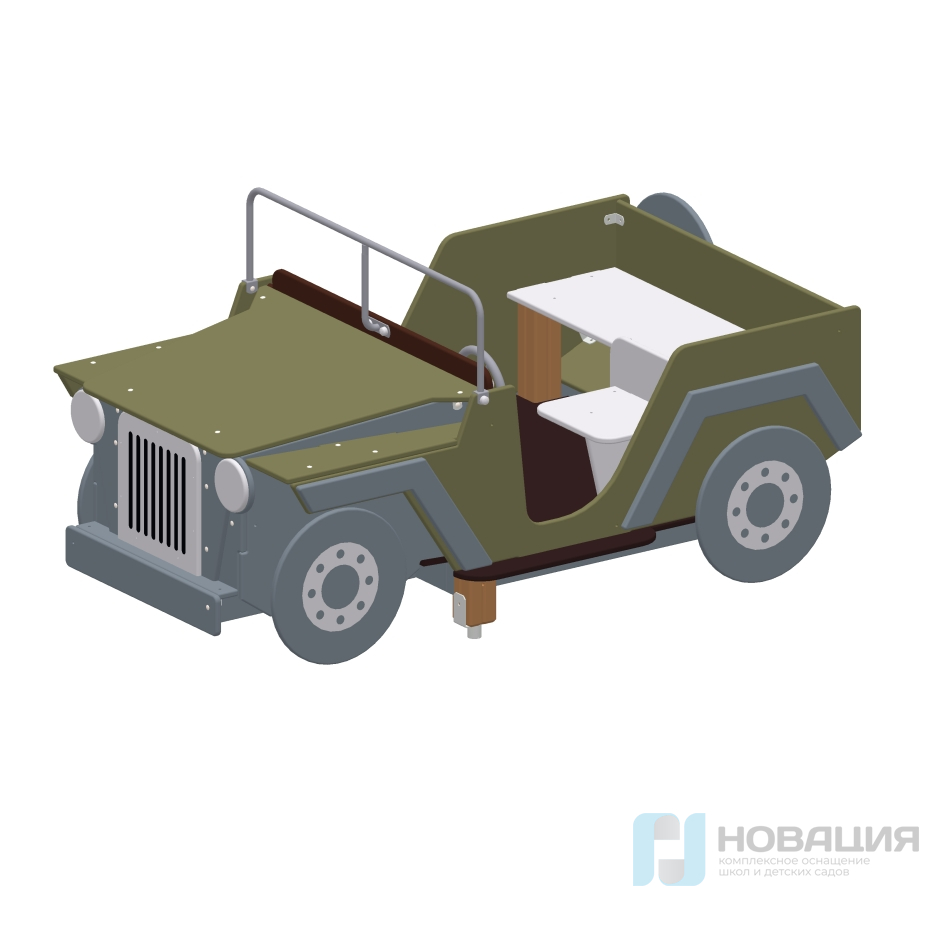 Конструкция дополнена элементами в виде руля, фар, колес (в том числе, запасного колеса), решетки радиатора. На боковых панелях 2 выреза-входа. Установка выполнена из непромокаемых и нескользящих материалов.